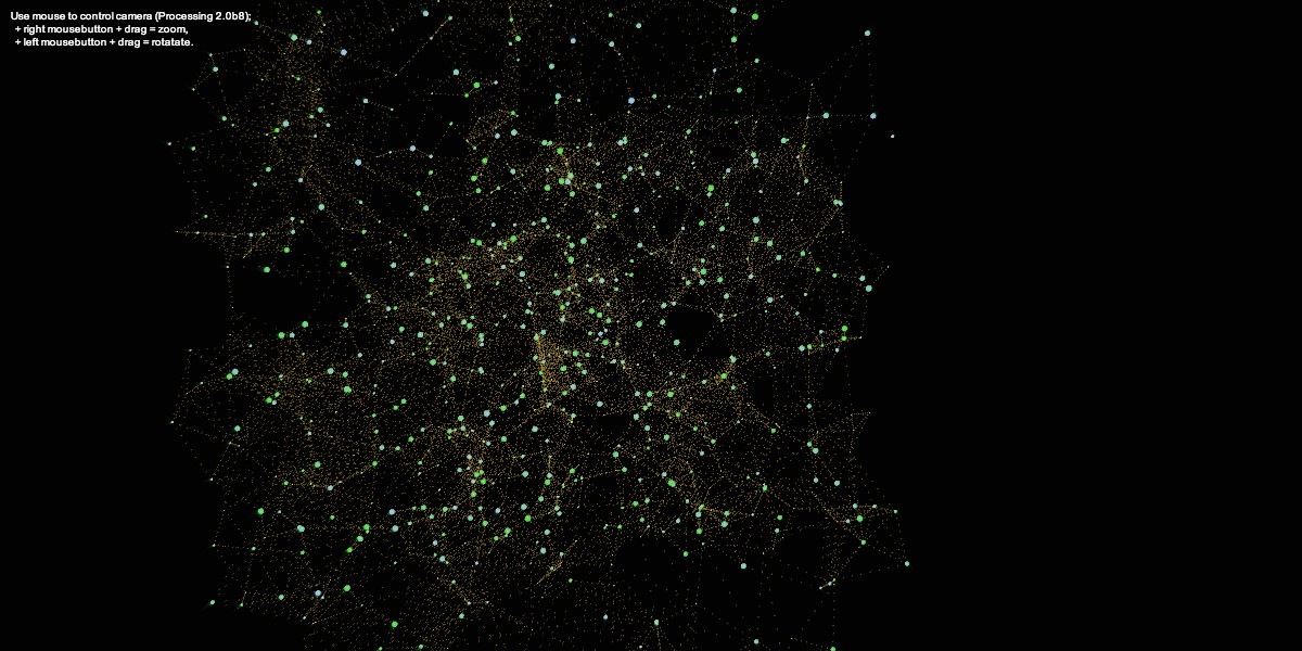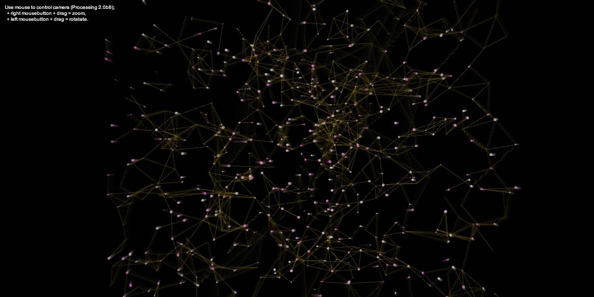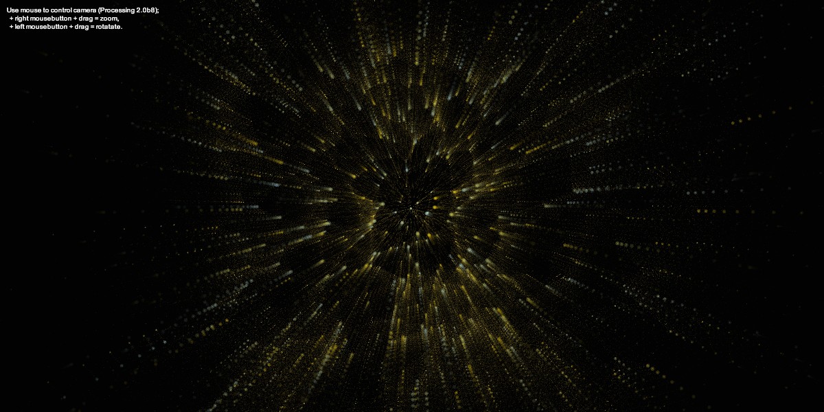 'Stjernehimlen' er blevet til gennem en skitseringsfase i Processing. Udfordringen har været at ramme et tempo der stemmer overens med musikken på det givne tidspunkt, samtidig med at kunne formidles i en detaljeringsgrad der er aflæselig fra salen - det er her af afgørende karakter hvordan projektorernes tekniske specifikationer hænger sammen. Jeg forsøgte at skabe et abstrakt og ikke mindst rummeligt univers der virker forståeligt i sin skala. Det langsomme tempo er et forsøg på at understrege rummets størrelse og fornemmelse. Musikkens anslag på det givne tidspunkt i opsætningen fordrer en også, i denne sammenhæng, en nedtrapning i bevægelserne, og det har her været vigtigt at balancere den hastighed der giver den rumlige fornemmelse parallelt med tilpasningen til musikkens “temperament”. Nedenfor ses forskellige resultater fra skitseringsprocessen.